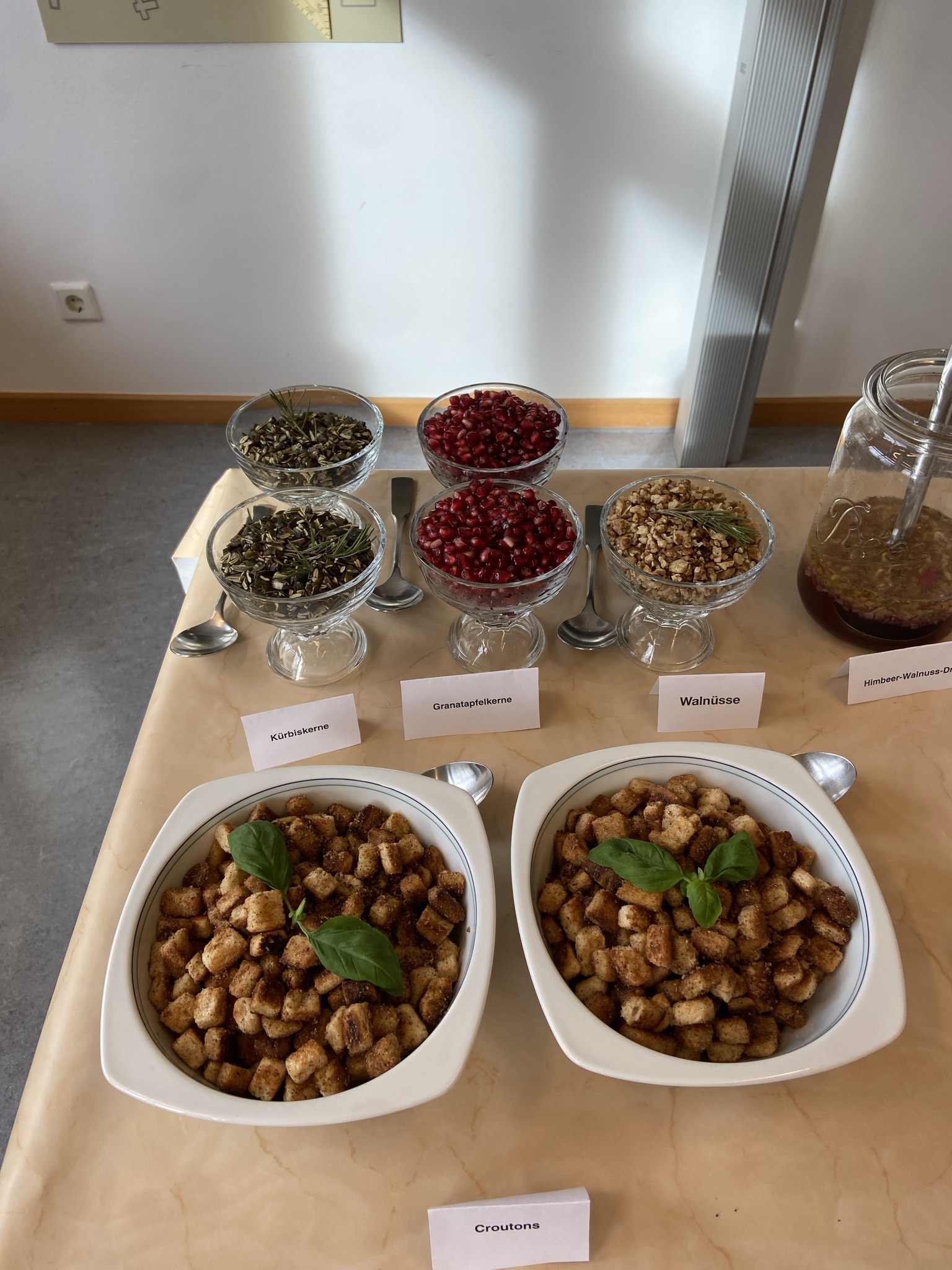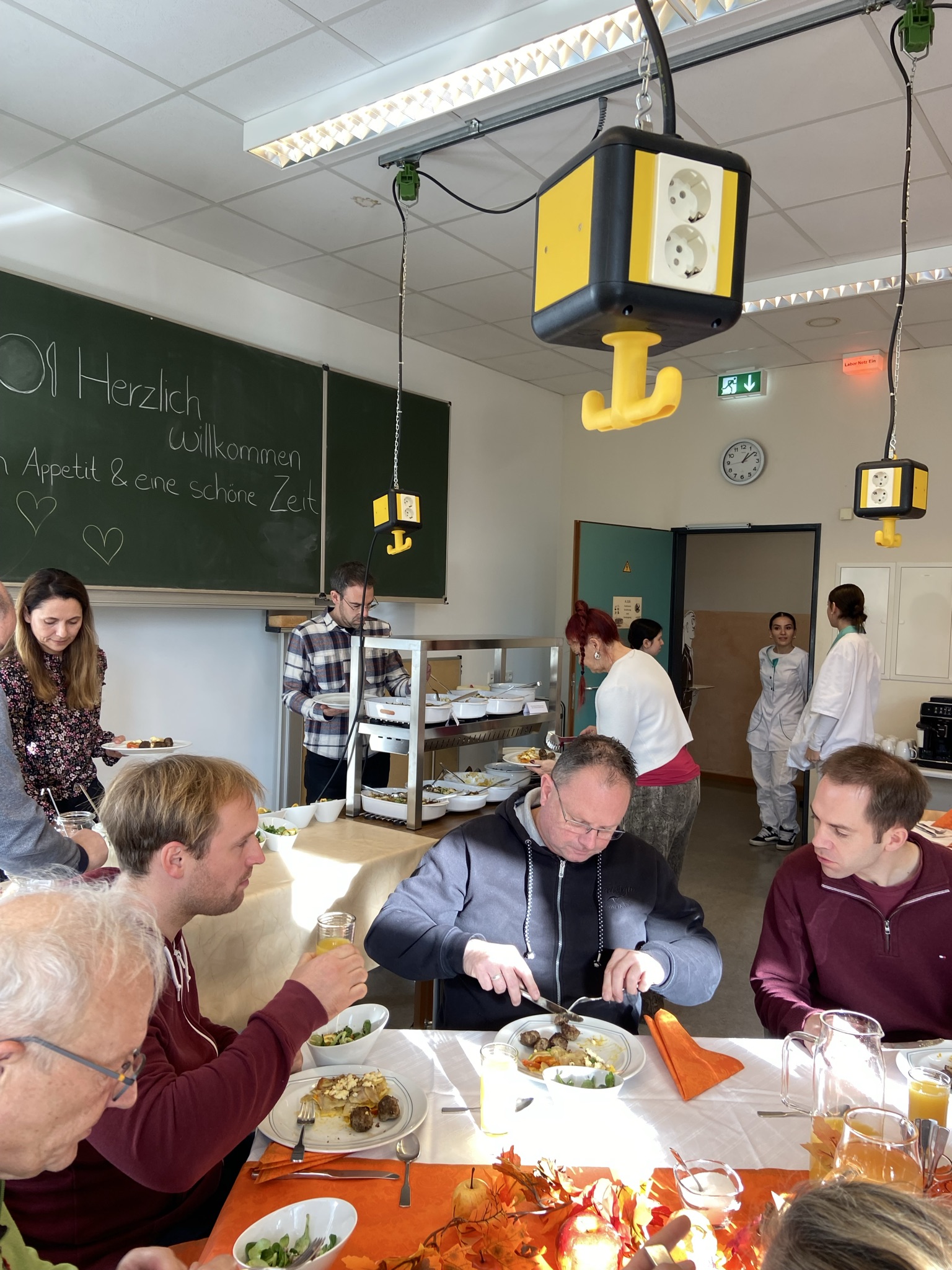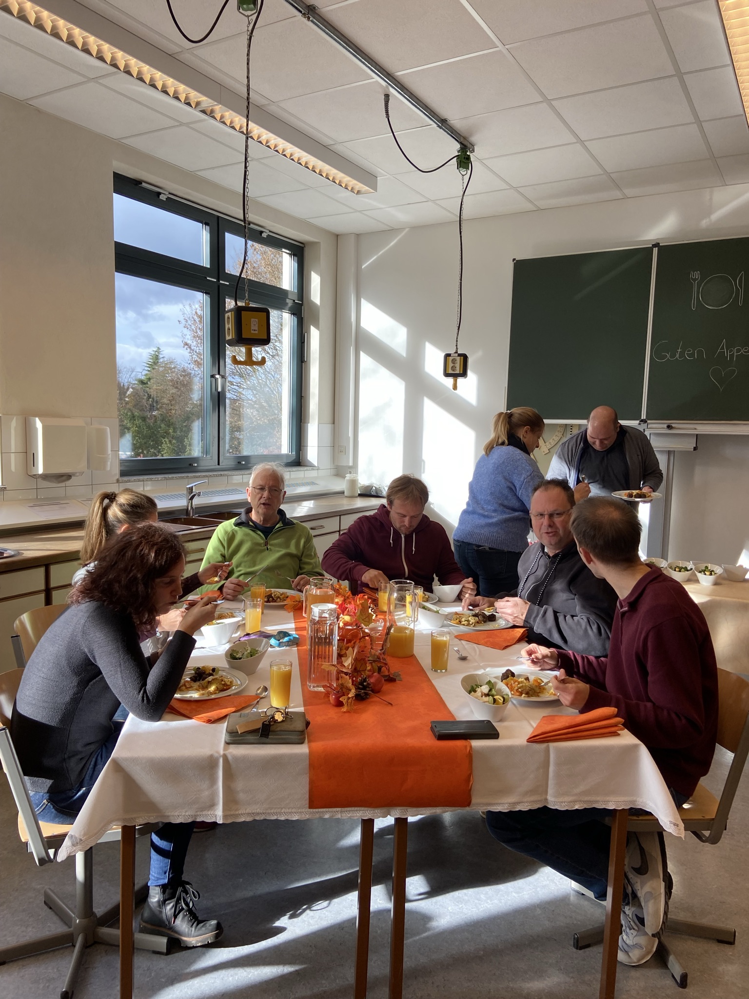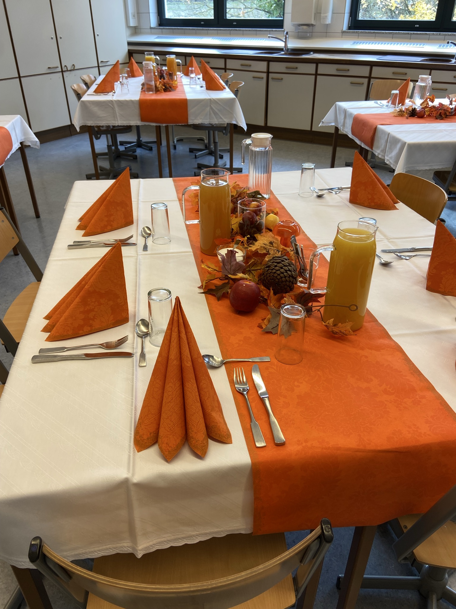 An diesem zum Teil sonnigen Mittag fanden die Lehrer liebevoll gedeckte Tische in Orange- und Brauntönen passend zum Thema vor. Die Speisenpräsentation erfolgte in Buffetform mit sauberem Aufbau, Beschilderung der Gerichte. Sogar die Teller waren vorgewärmt, um die Qualitäts- und Temperaturbindung zu sichern.