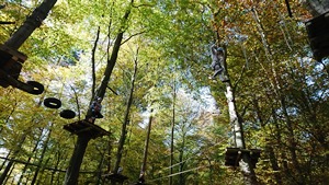 Egal ob bei der Balljonglage, dem SinObelisk, dem Systeaming-Tisch, diversen Konzentrationsspielen, „Blindenführung“, Tastraining oder Argumentationsübungen, die Schülerinnen und Schüler waren immer wieder gefordert, sich einzubringen und konzentriert für das Team und dadurch auch für sich mitzuarbeiten. Wie bereits im letzten Jahr besuchten die drei Klassen abwechselnd an je einem Tag den Waldseilgarten in Mehlingen. Nach weiteren Teamtrainings vor Ort durften die Schülerinnen und Schülern nach der Sicherheitseinweisung selbstständig ihre gewählten Parcours durchklettern. Daher hieß es hinauf in luftige Höhen und bestückt mit Helm und Sicherheitsgurt Hindernisse wie Seile, sich bewegende Holzteile oder auch Slacklines überwinden.