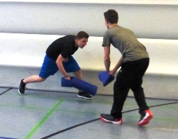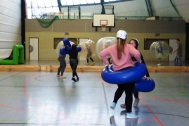 Andere Möglichkeiten des ‚Aggressionen Herauslassens‘ konnten die Schülerinnen und Schüler anschließend im praktischen Teil an verschiedenen Stationen ausprobieren. So spielten Kleingruppen Bubbleball-Fußball, bei dem das Umrennen des Gegners nicht zu kurz kommen durfte, führten Armdrück-Wettbewerbe durch, versuchten Partnerinnen und Partner aus einem bestimmten Feld zu schieben oder setzten die volle Kraft und Energie beim Boxen und Kicken gegen Boxkissen ein. Fairness und Respekt gegenüber dem Gegner waren hierbei große Aspekte, die zum Beispiel durch einen Handschlag vor Beginn des Kämpfens oder das Einhalten von verschiedenen, vereinbarten Regeln Ausdruck fanden.