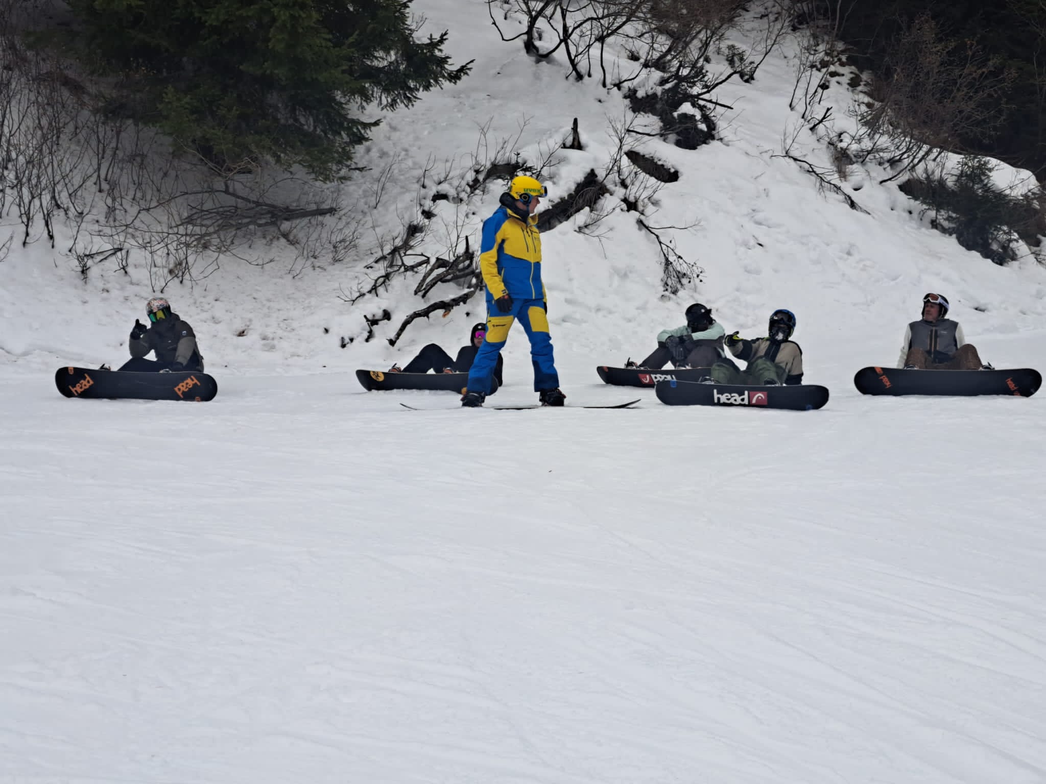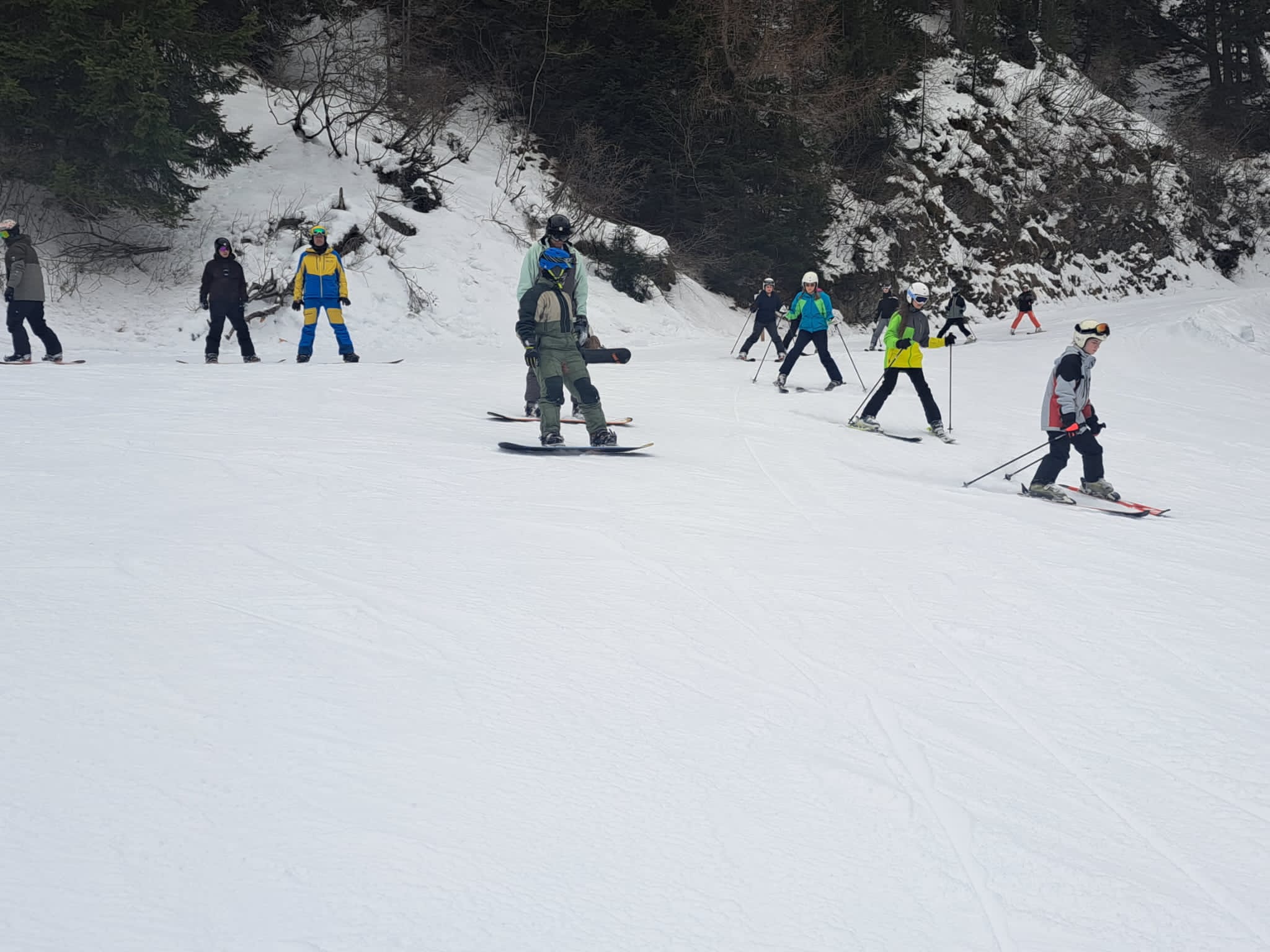 Nach einem kräftigenden Frühstück Montag Morgen hieß es "ab auf die Piste!" Ob Ski oder Snowboard, Anfänger oder Profi - in Gruppen aufgeteilt wagte sich die Gruppe auf den Gipfel und hinab in die winterliche Pracht.