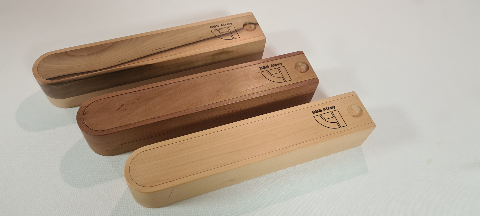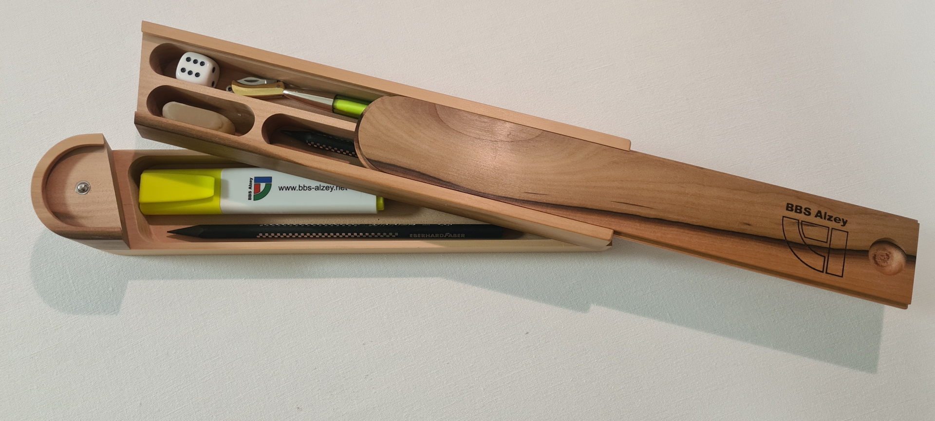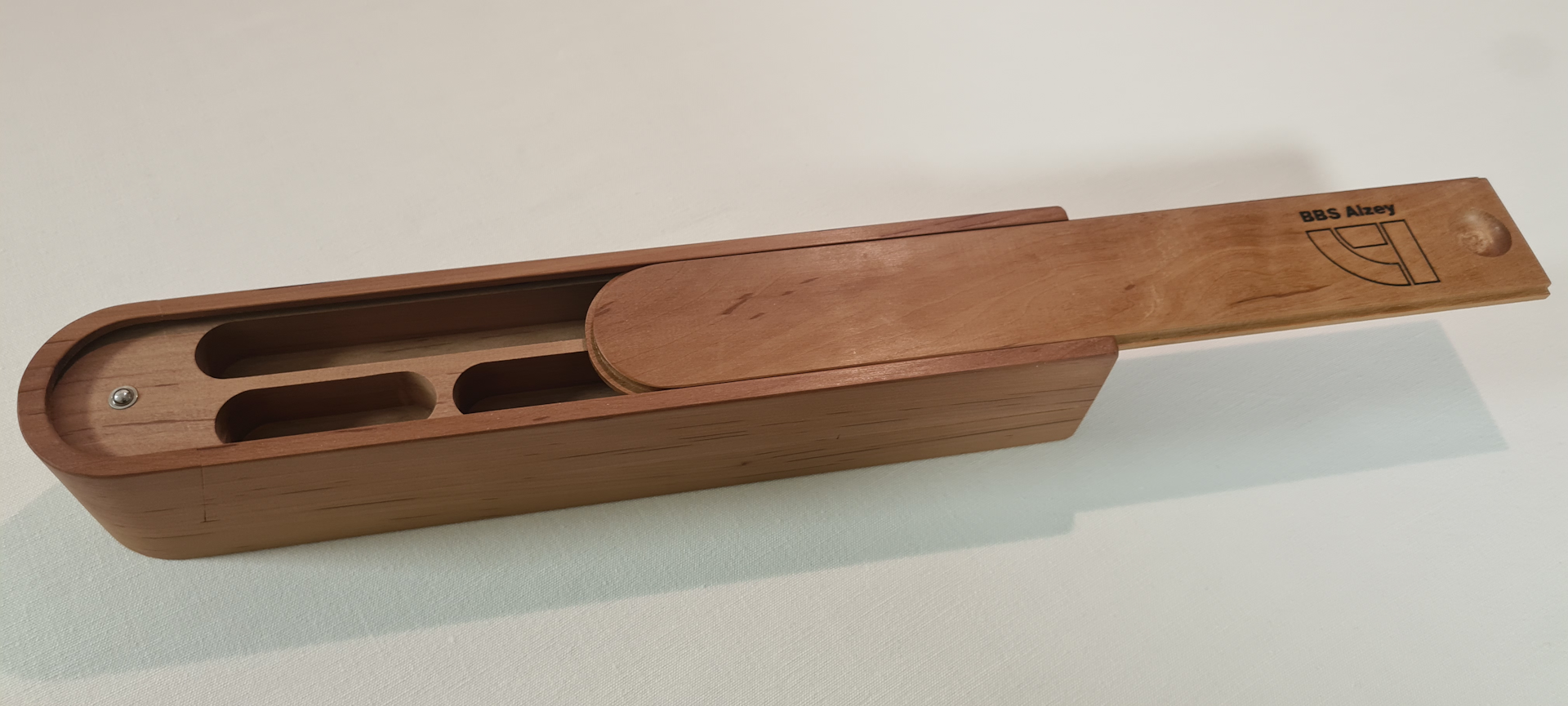 In der Holzwerkstatt der BBS Alzey herrscht emsiges Treiben. Unter der sachkundigen Anleitung ihres Fachpraxislehrers Peter Moritz haben sich elf angehende Holzfachleute der Berufsfachschule 1 Holztechnik (BF1 Ho 23) daran gemacht, ein besonderes Projekt zu verwirklichen: den Griffelkasten. In 4 Wochen widmen sie sich mit Hingabe und handwerklichem Können diesem Vorhaben. "Ihr selbst gebauter Griffelkasten ist nicht nur ein praktisches Utensil, sondern auch ein Symbol für ihre Teamarbeit und ihr Können im Umgang mit dem Werkstoff Holz", lobt Peter Moritz seine Klasse nach dem Projekt.
