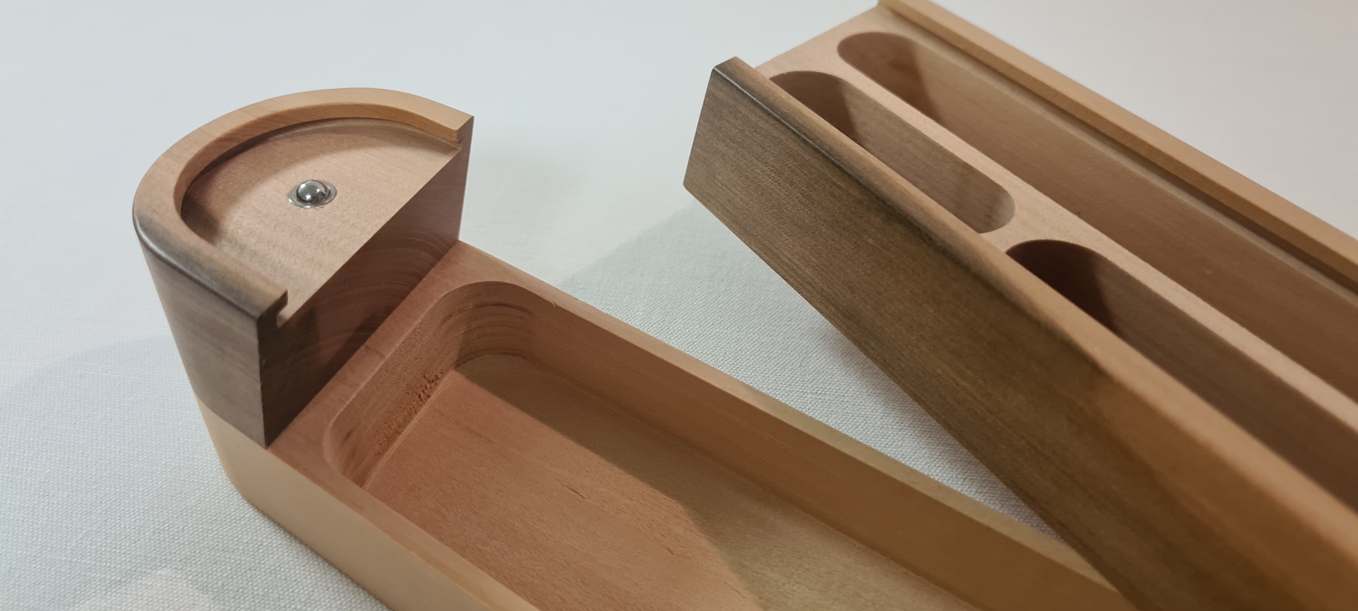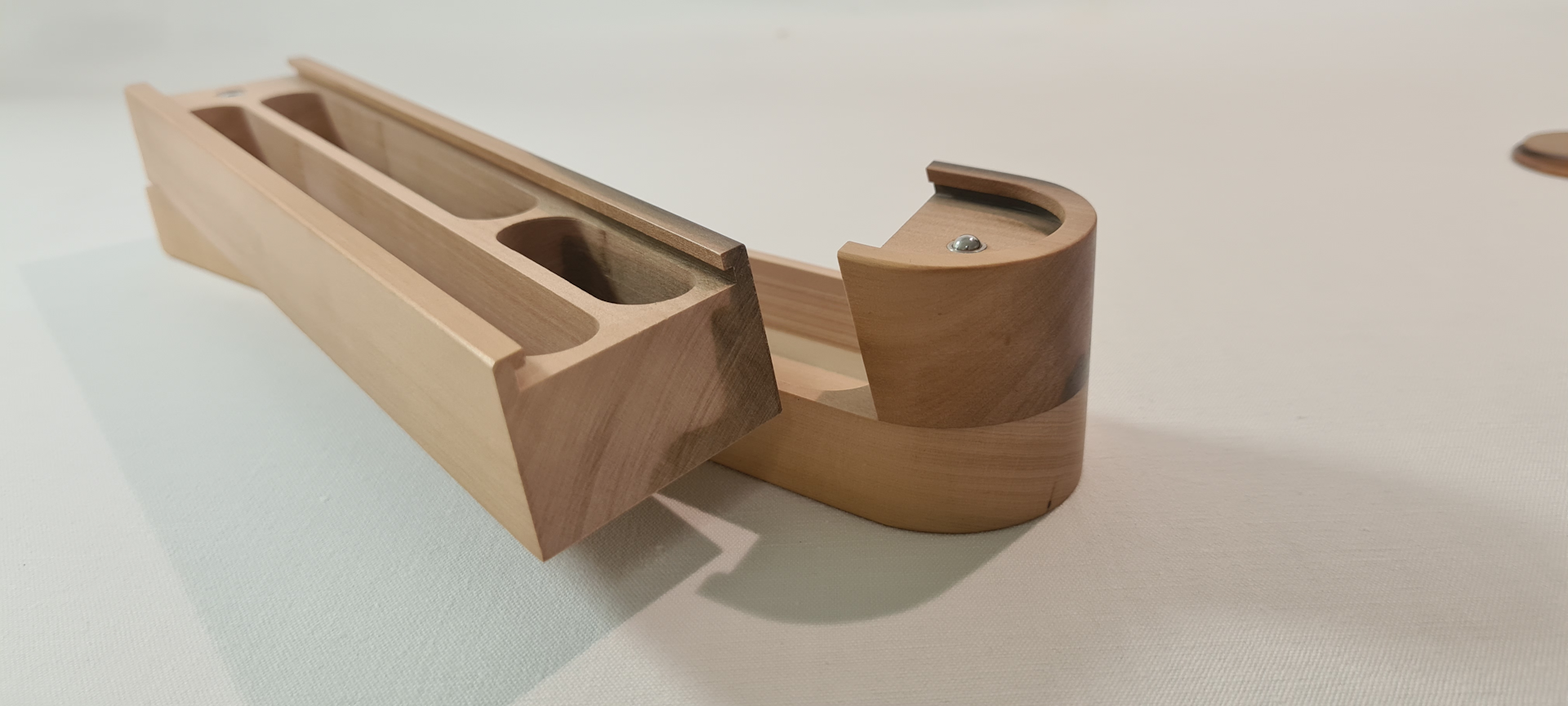 Aber wie gingen die elf das Projekt an? Mit Feile und Abrichthobelmaschine machten sich die Schülerinnen und Schüler zunächst ans Werk. Aus hellem und dunklem Holz entstanden die einzelnen Teile des Griffelkastens. Präzise Schnitte wurden mit der Formatkreissäge ausgeführt, während Schablonen für die CNC-Maschine entworfen und gebaut wurden. Leim-Schablonen und Schleifschablonen sorgten dafür, dass jedes Detail perfekt passte.