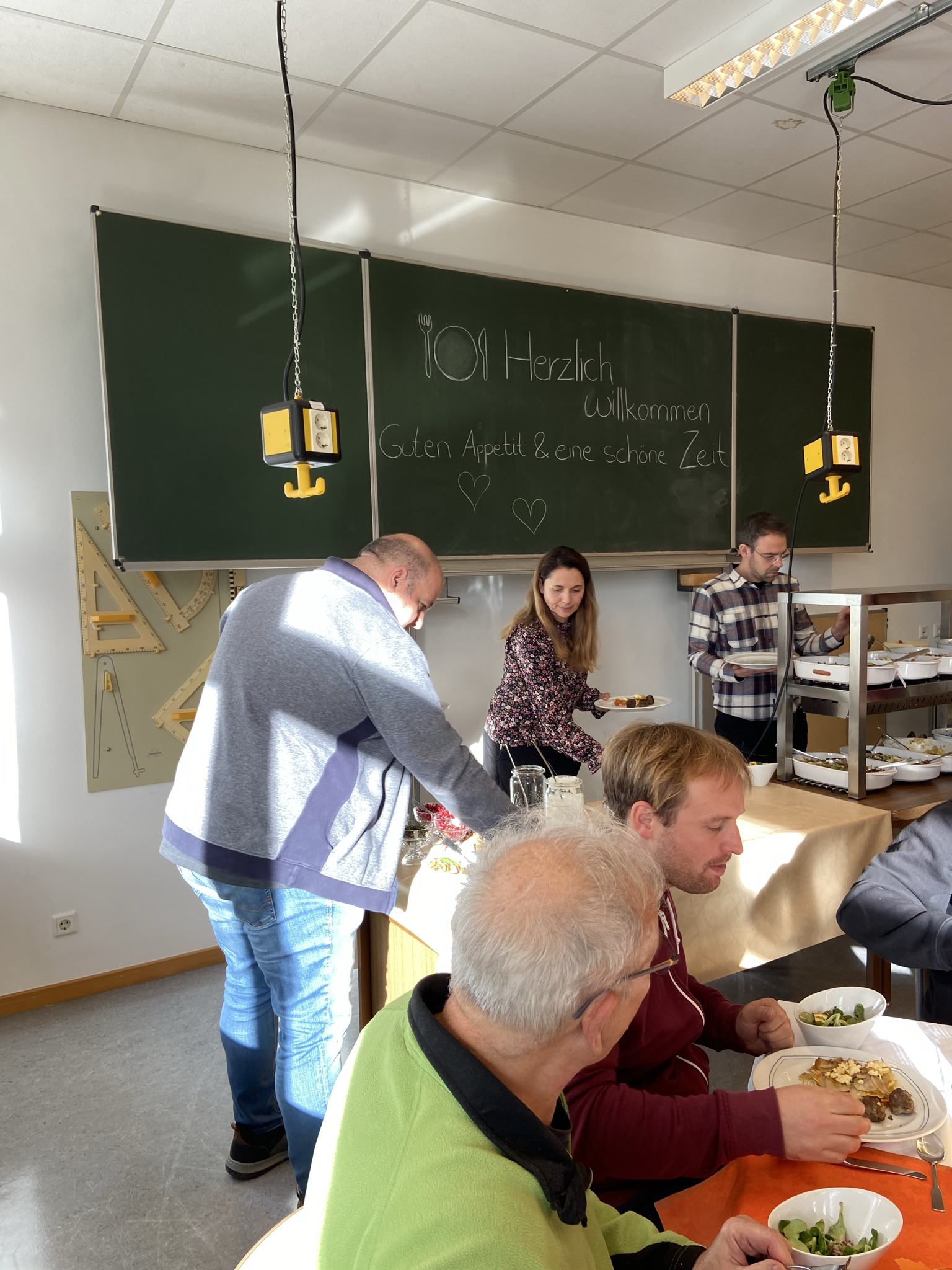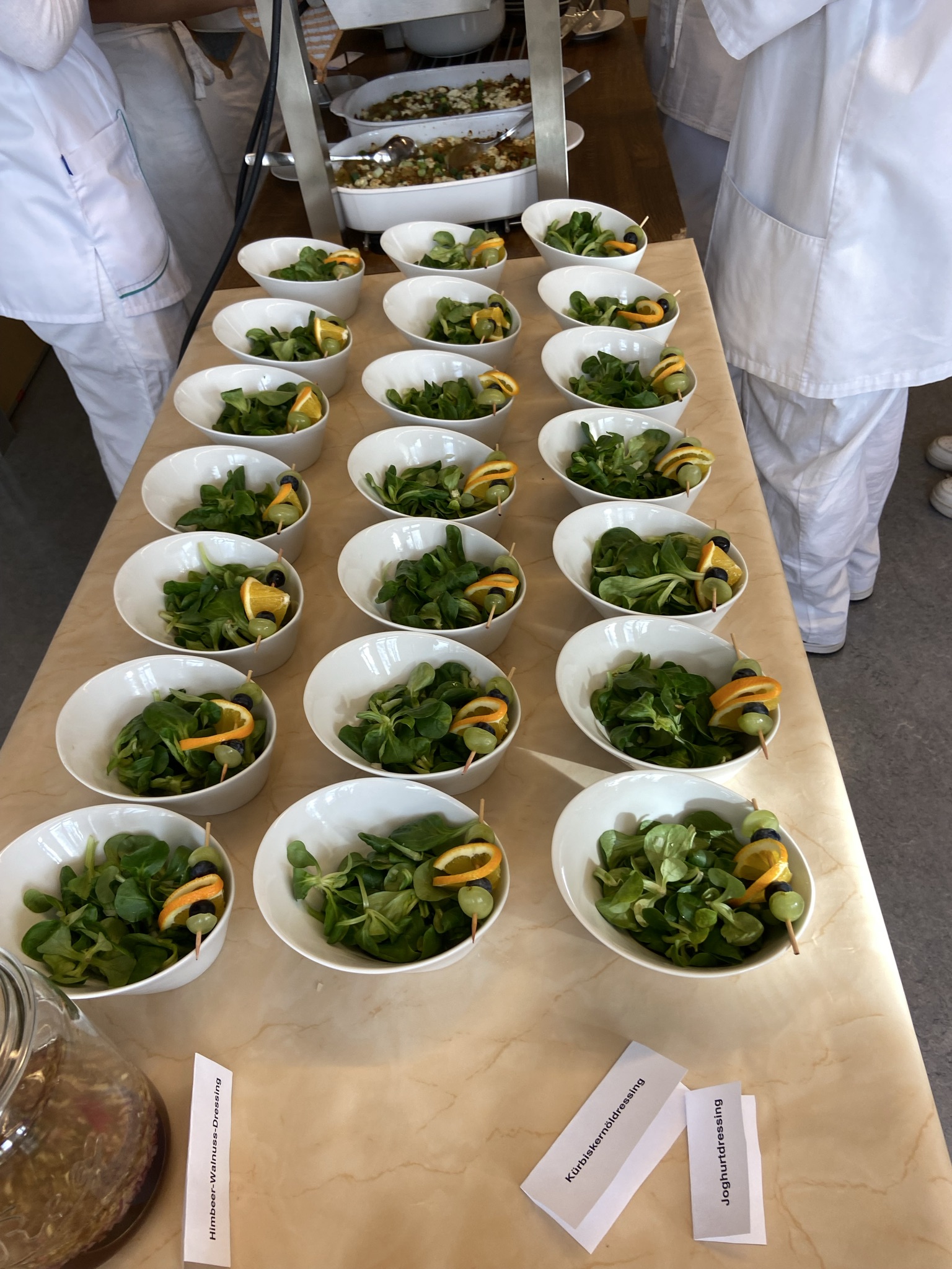 An diesem zum Teil sonnigen Mittag fanden die Lehrer liebevoll gedeckte Tische in Orange- und Brauntönen passend zum Thema vor. Die Speisenpräsentation erfolgte in Buffetform mit sauberem Aufbau, Beschilderung der Gerichte. Sogar die Teller waren vorgewärmt, um die Qualitäts- und Temperaturbindung zu sichern.